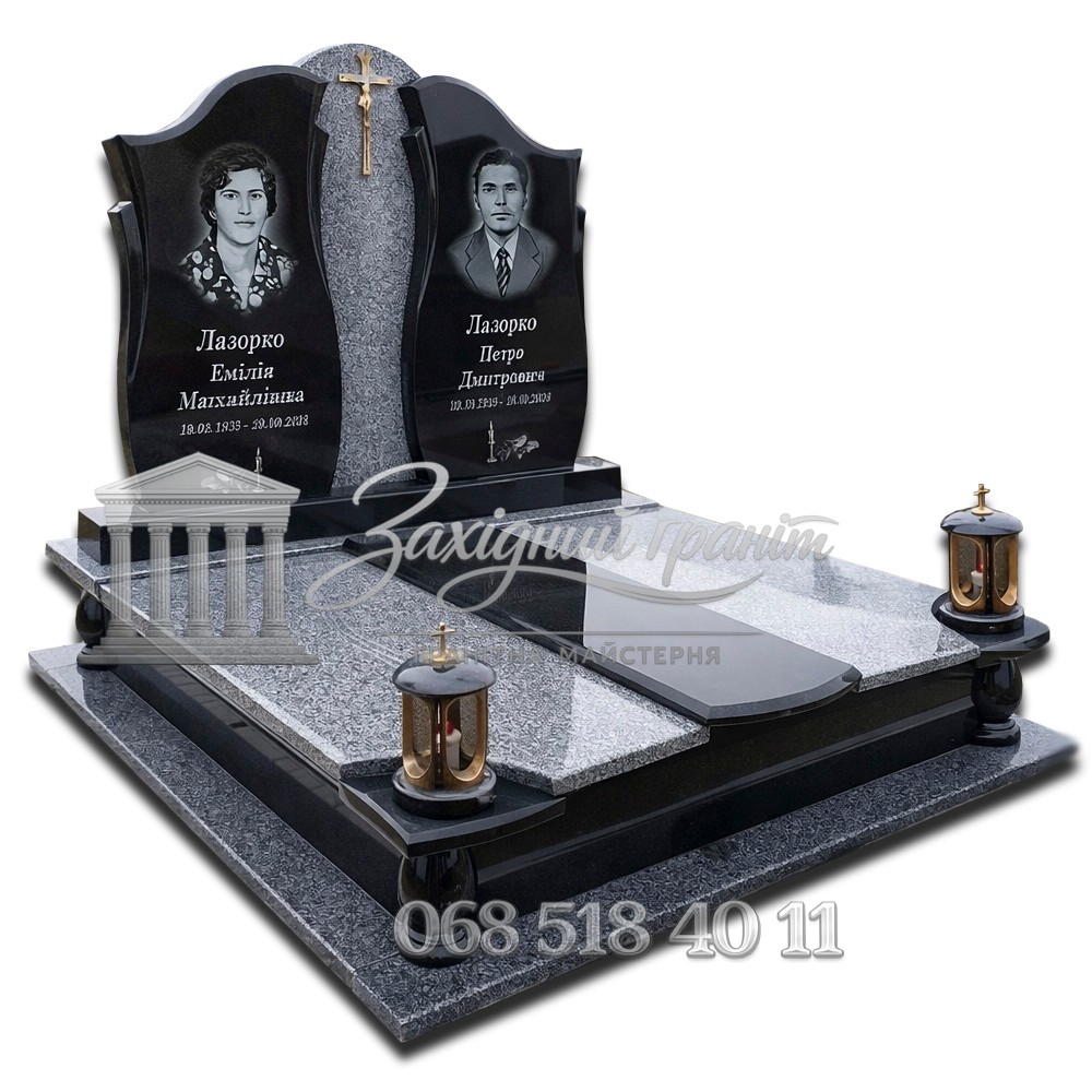 Подвійний гранітний пам’ятник з чорного та сірого граніту. Контрастна модель із світлою основою та темними стелами. Лаконічний дизайн підходить для сучасного оформлення. Доступна можливість вибору відкритого або закритого квітника.