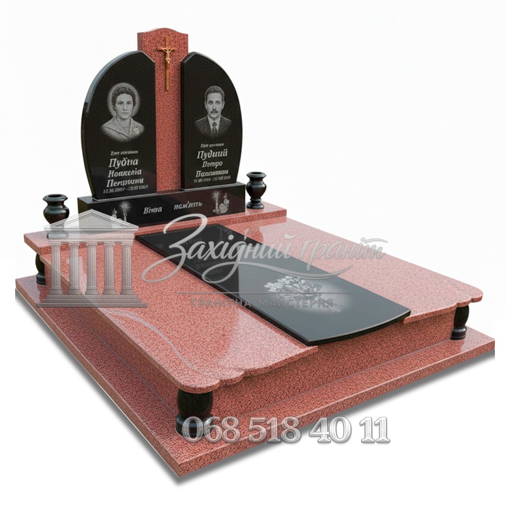 Подвійний гранітний пам’ятник з червоного та чорного граніту. Яскрава основа гармонійно поєднується з темною стелою. Композиція виглядає виразно та солідно. Доступна можливість вибору відкритого або закритого квітника.