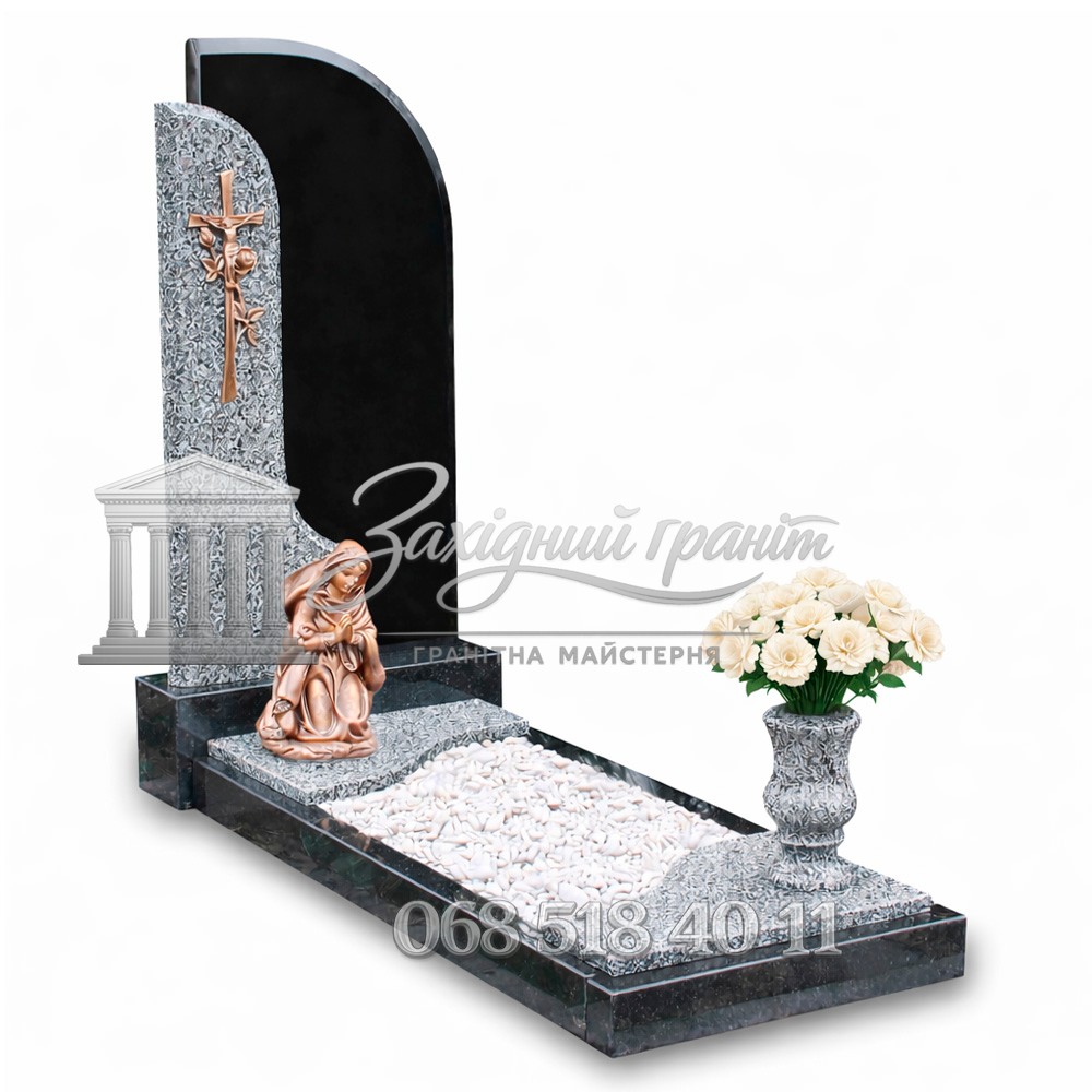 Гранітний пам’ятник з чорного та сірого граніту. Фігурна стела з плавними лініями виглядає елегантно та сучасно. Світла основа підкреслює глибину чорного кольору. Доступна можливість вибору відкритого або закритого квітника.