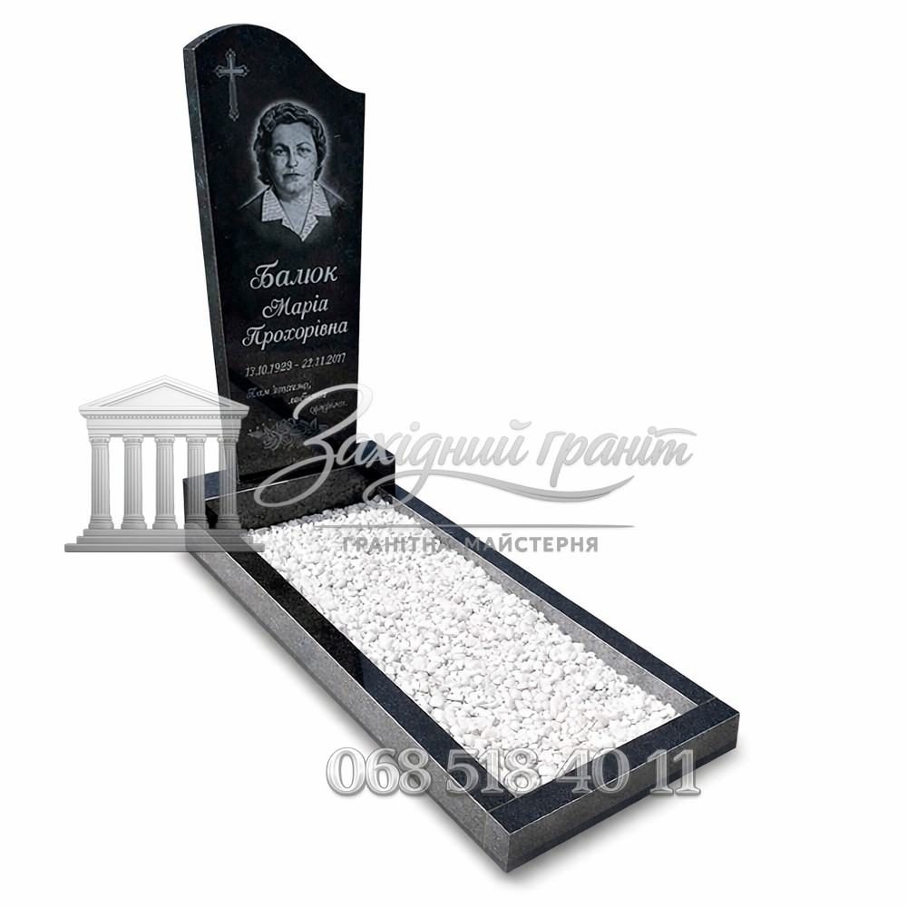Модель із фігурним верхом та сучасним оформленням. Чорний граніт забезпечує насичений колір і довготривалу експлуатацію. Передбачена можливість вибору відкритого або закритого квітника. Підходить для індивідуального гравіювання.