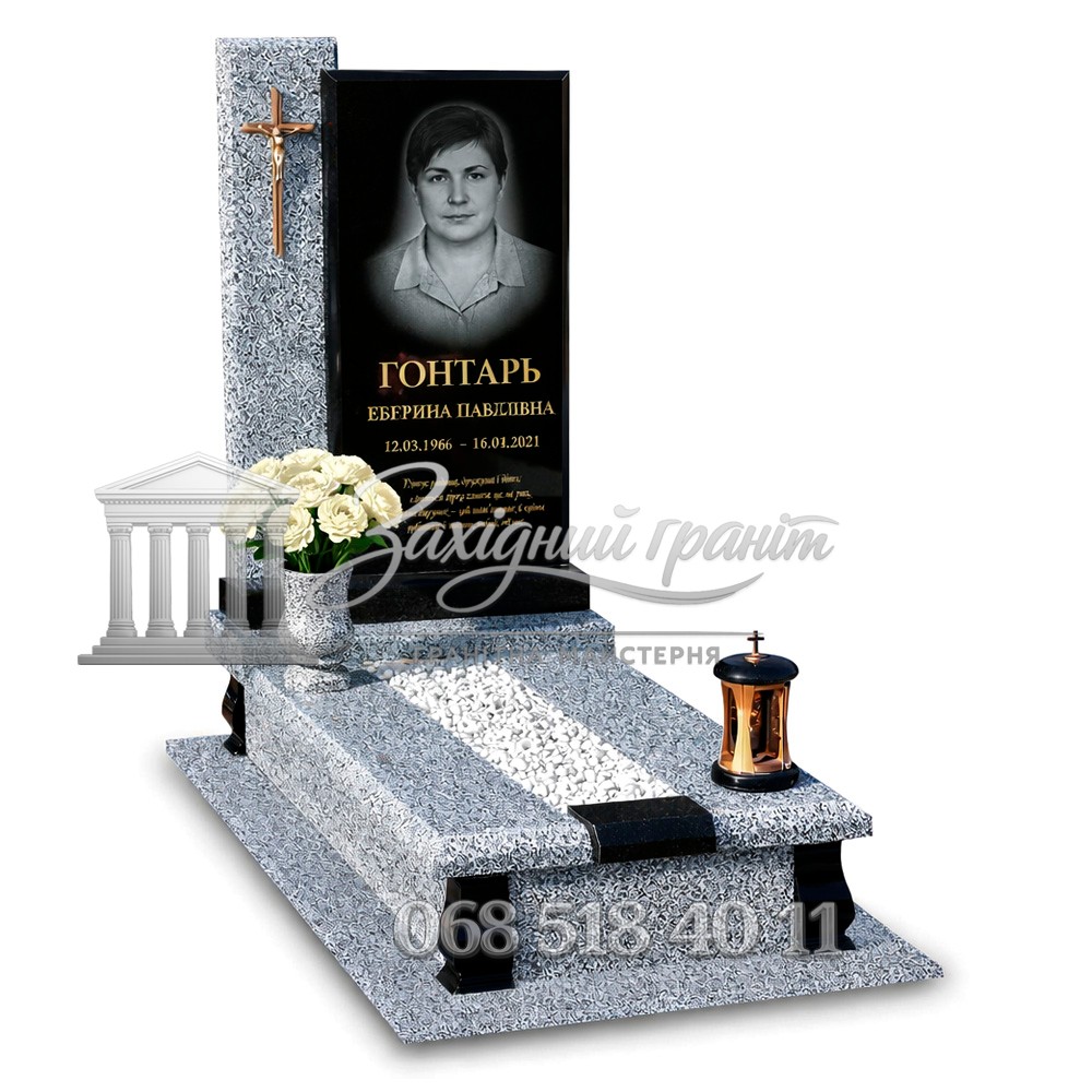 Гранітний пам’ятник з чорного та сірого граніту. Стримана модель із прямими лініями та світлим квітником. Гармонійне поєднання кольорів виглядає елегантно. Доступна можливість вибору відкритого або закритого квітника.