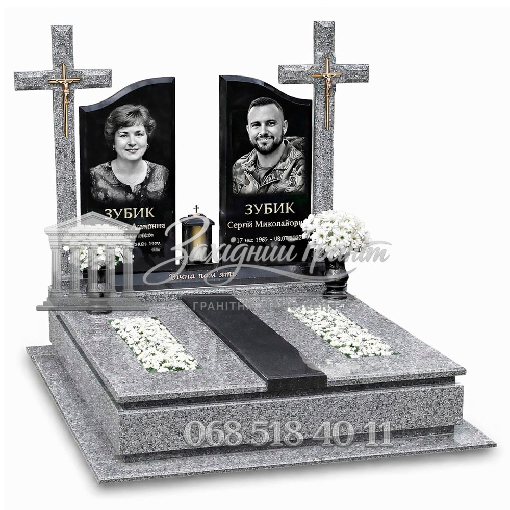 Подвійний гранітний пам’ятник з чорного та сірого граніту. Класична модель із високими хрестами та світлою основою. Стриманий дизайн підкреслює традиційний стиль. Доступна можливість вибору відкритого або закритого квітника.