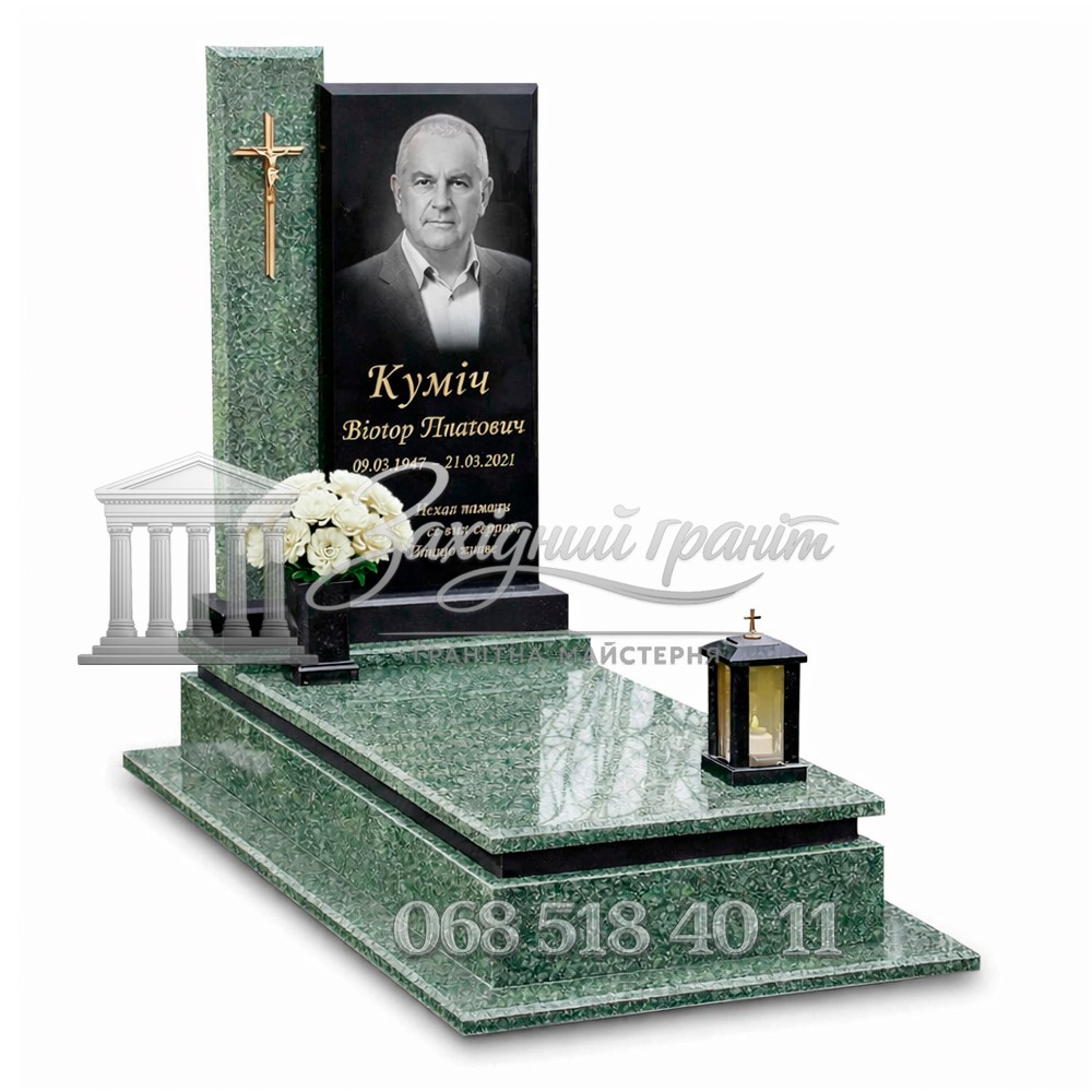 Гранітний пам’ятник із зеленого та чорного граніту. Поєднання зеленого каменю з темною стелою створює оригінальний і благородний вигляд. Модель виглядає виразно та сучасно. Передбачена можливість вибору відкритого або закритого квітника.
