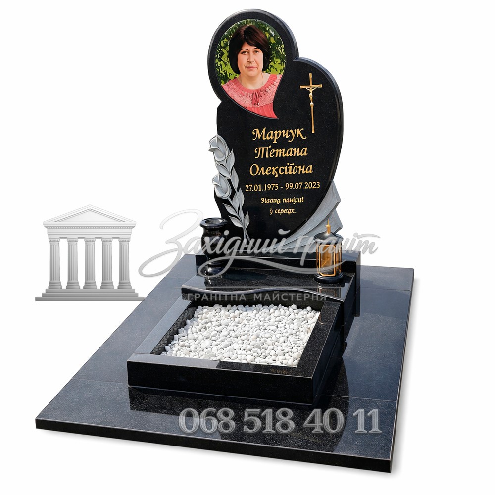 Гранітний пам’ятник з чорного граніту. Елегантна стела з плавною формою виглядає витончено та акуратно. Глибокий чорний колір додає благородності. Доступна можливість вибору відкритого або закритого квітника.