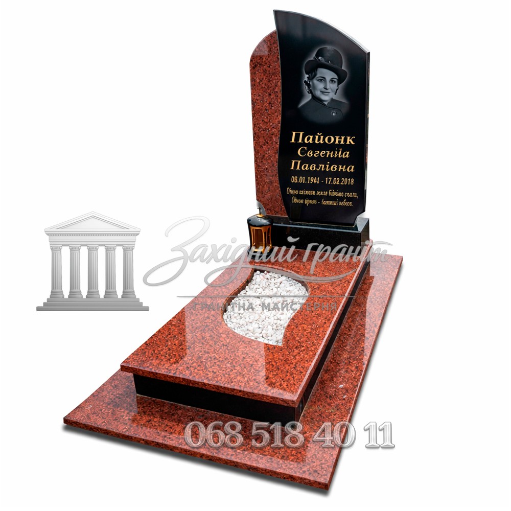 Гранітний пам’ятник з чорного та червоного граніту. Яскраве поєднання червоної основи з темною стелою створює виразний контраст. Модель виглядає солідно та оригінально. Передбачена можливість вибору відкритого або закритого квітника.
