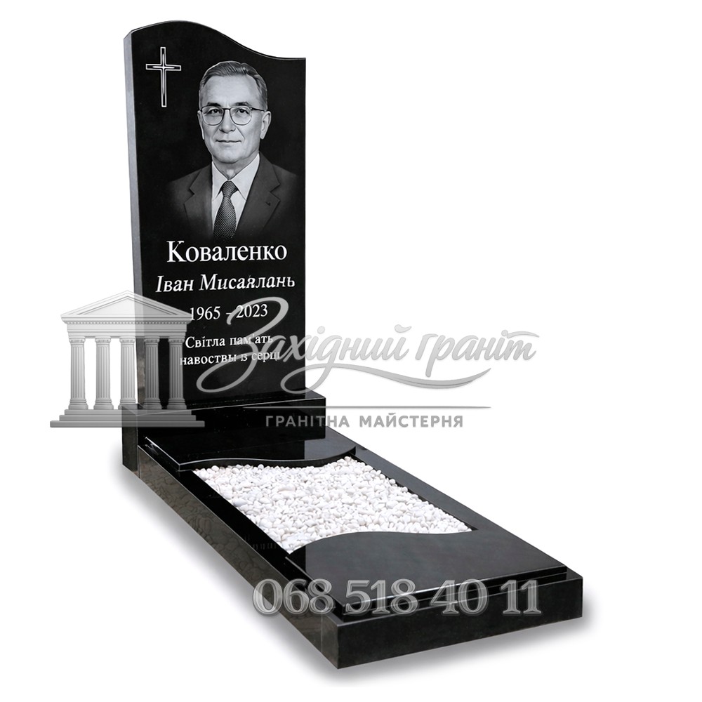 Стриманий варіант із чіткими лініями та акуратною основою. Полірований камінь підкреслює естетичний вигляд виробу. Можлива комплектація з відкритим або закритим квітником. Пам’ятник розрахований на тривалий термін служби.