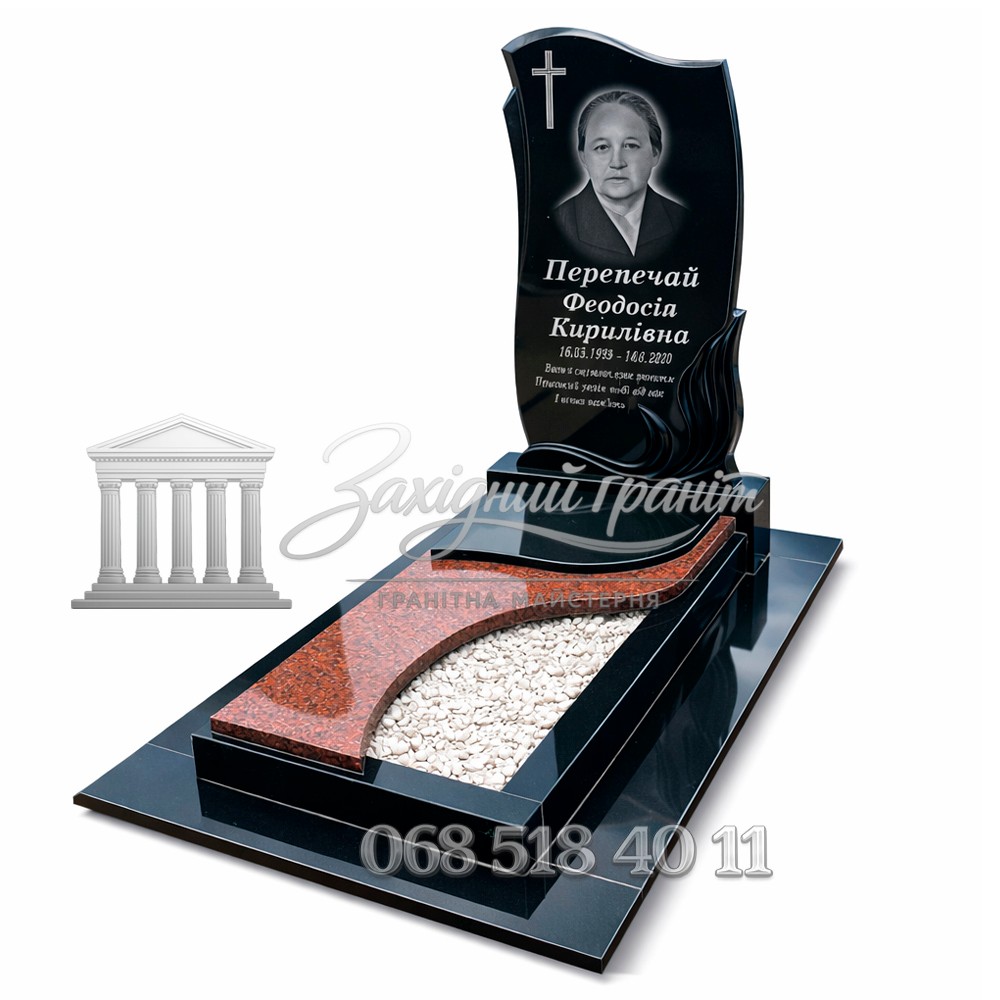 Гранітний пам’ятник з чорного та червоного граніту. Контрастні відтінки додають виробу глибини та виразності. Фігурна форма стели підкреслює індивідуальність моделі. Доступна можливість вибору відкритого або закритого квітника.