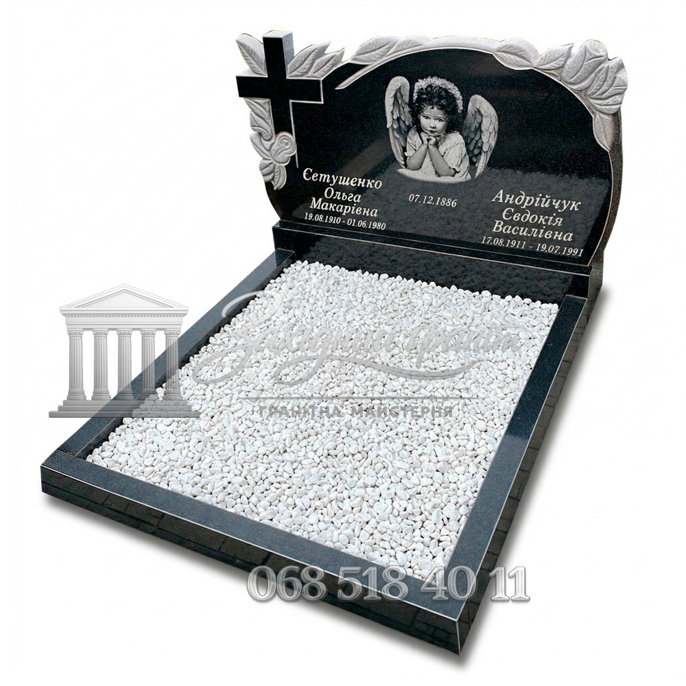 Подвійний гранітний пам’ятник з чорного граніту. Модель із відкритим квітником та фігурною стелою виглядає сучасно та гармонійно. Камінь довговічний і стійкий до погодних умов. Доступна можливість вибору відкритого або закритого квітника.