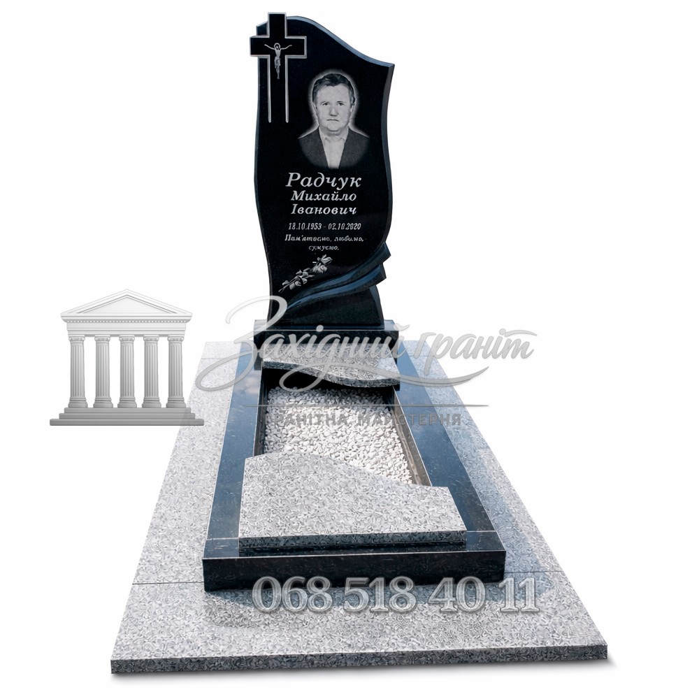 Гранітний пам’ятник з чорного та сірого граніту. Фігурна стела з декоративним хрестом виглядає елегантно та стримано. Поєднання кольорів додає композиції гармонії. Передбачена можливість вибору відкритого або закритого квітника.