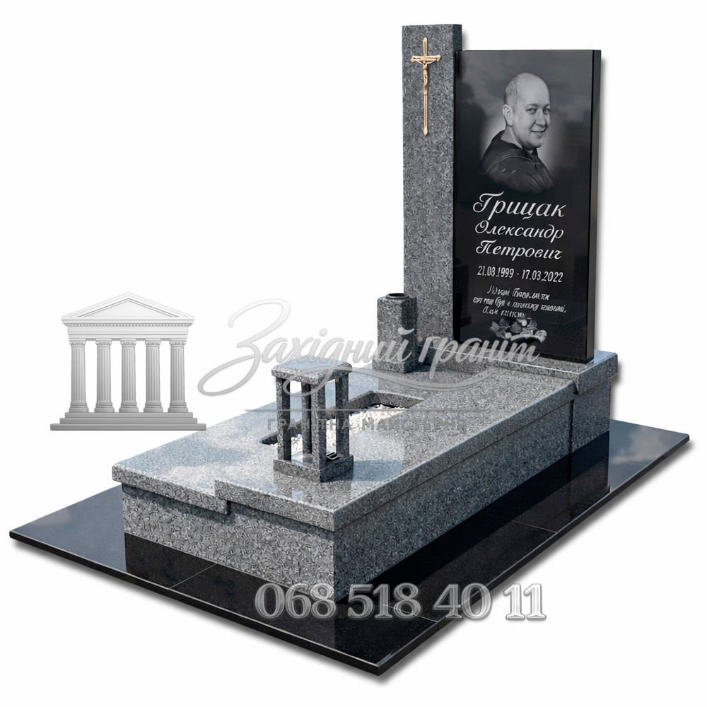 Гранітний пам’ятник з чорного та сірого граніту. Класична композиція з масивною основою та стриманою формою стели. Контраст відтінків створює глибину та виразність. Передбачена можливість вибору відкритого або закритого квітника.