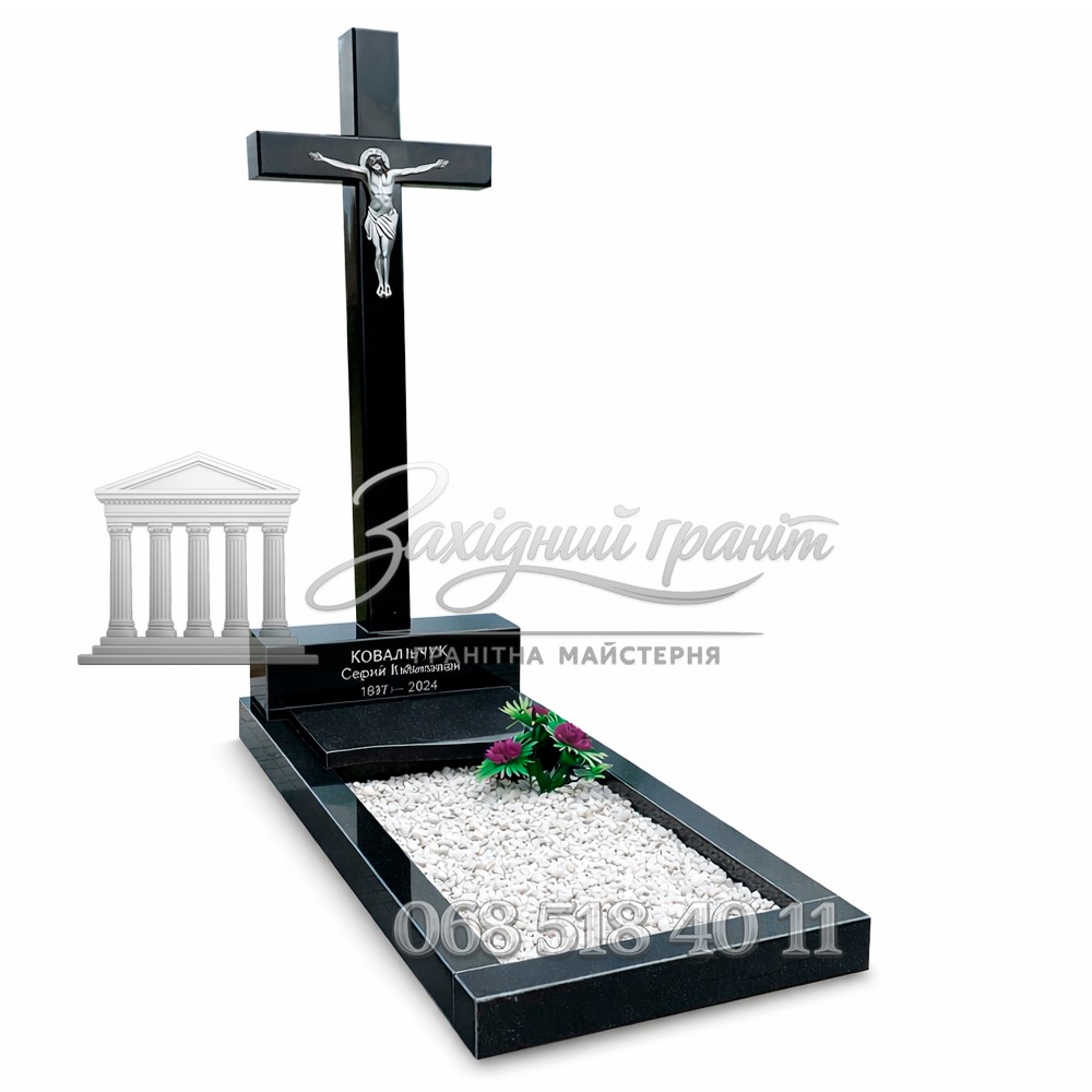 Модель із хрестом та класичною формою. Глибокий чорний колір додає композиції благородності. Передбачена можливість вибору відкритого або закритого квітника. Натуральний камінь стійкий до атмосферних впливів.