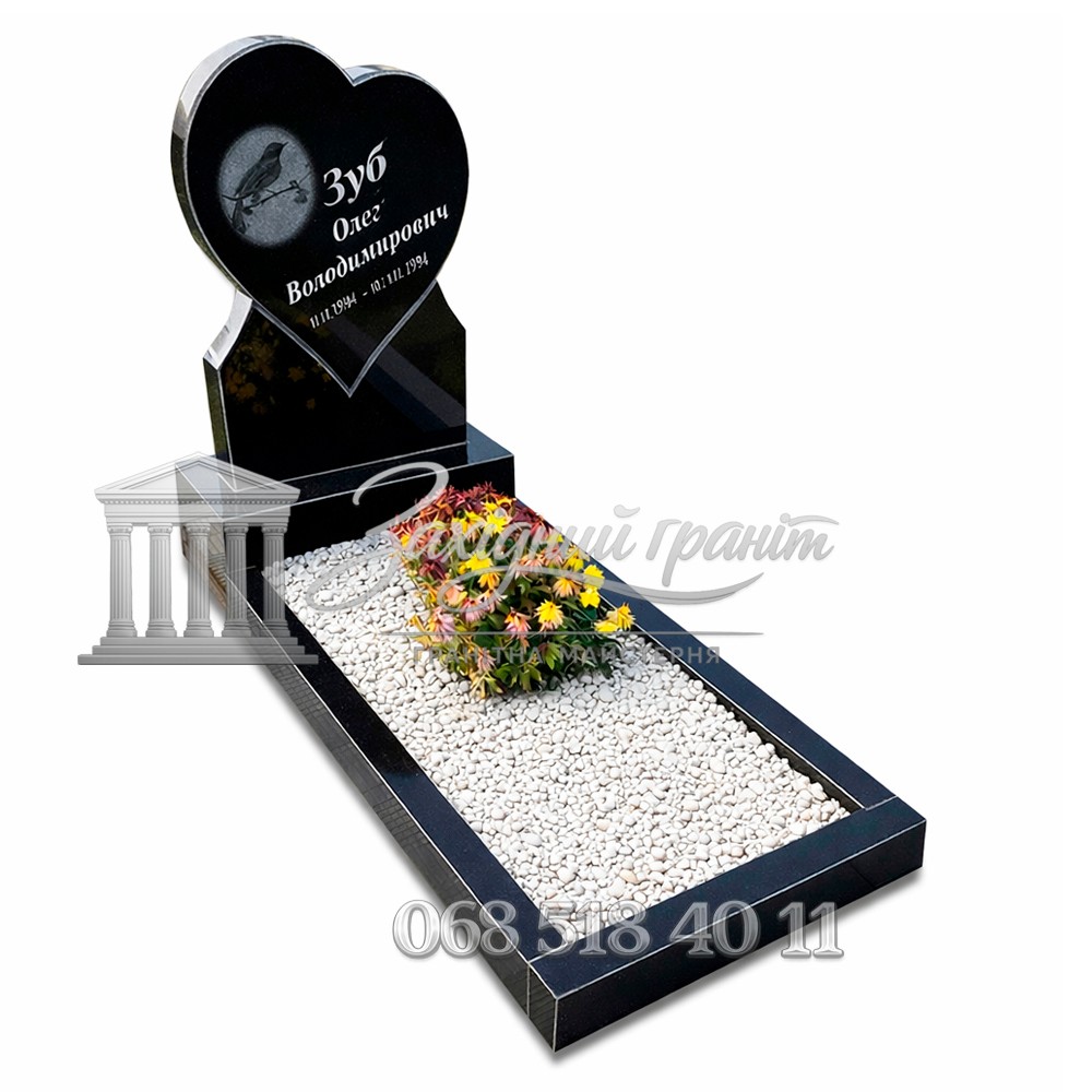 Гранітний пам’ятник з чорного граніту. Модель із фігурною формою у верхній частині виглядає оригінально та стримано. Насичений чорний колір підкреслює чіткість гравіювання. Передбачена можливість вибору відкритого або закритого квітника.