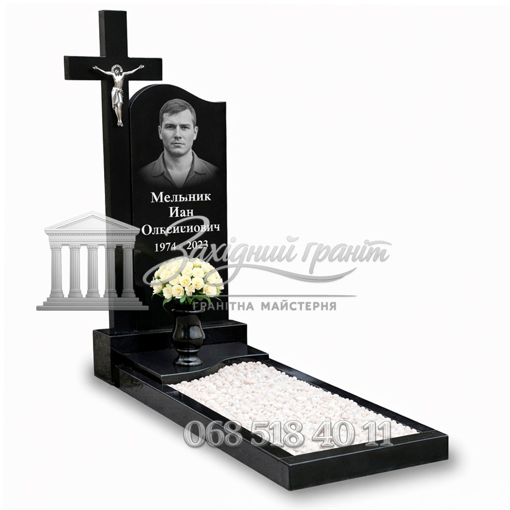 Оригінальна форма стели з хрестом надає виробу індивідуальності. Чорний граніт виглядає стримано та солідно. Передбачена можливість вибору відкритого або закритого квітника. Конструкція міцна та довговічна.