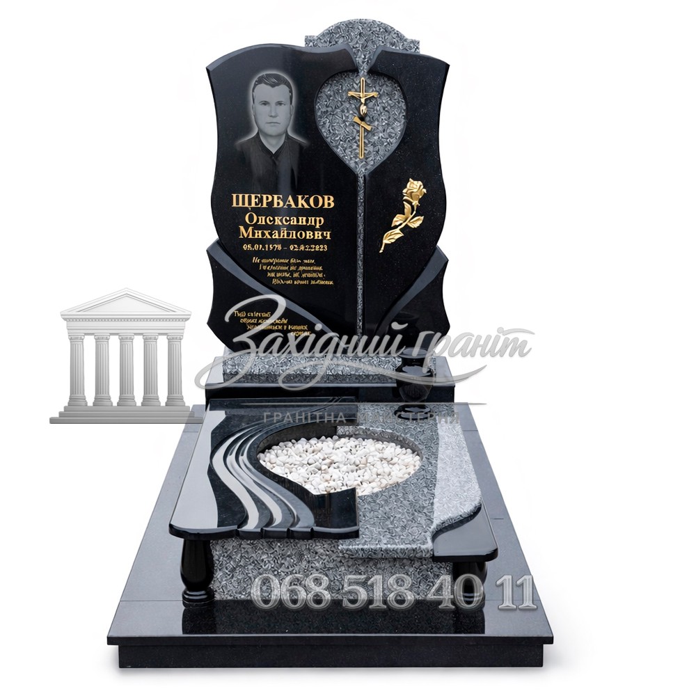Гранітний пам’ятник з чорного граніту. Оригінальна композиція з декоративними елементами виглядає сучасно та індивідуально. Глибокий чорний колір підкреслює форму стели. Передбачена можливість вибору відкритого або закритого квітника.