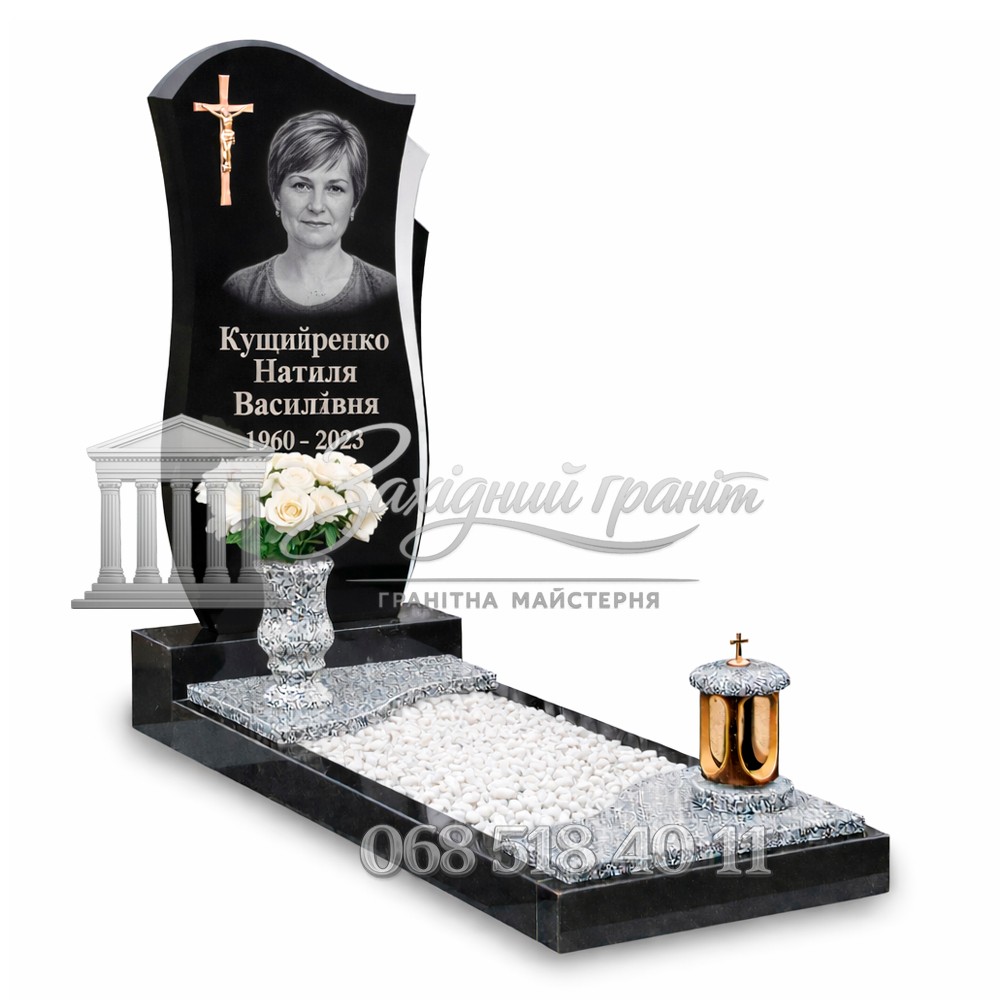 Плавна форма стели створює стриманий і гармонійний вигляд. Полірований камінь забезпечує довговічність та стійкість до погодних умов. Передбачена можливість вибору відкритого або закритого квітника.
